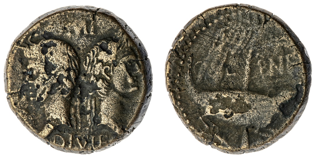 Roman Republic Augustus & Agrippa, 27BC-14AD, AE Dupondius, Laureate bust of Augustus right, diademed bust of Agrippa left, IMP DIVI.F P.P in legend, rev. Crocodile chained to palm tree surmounted by Laurel wreath, 2 palm fronds below crocodile, COL-NEM across field, 12.87g, (RIC.160; RPC.525) Corrosion to both sides of coin, worn, good to fine