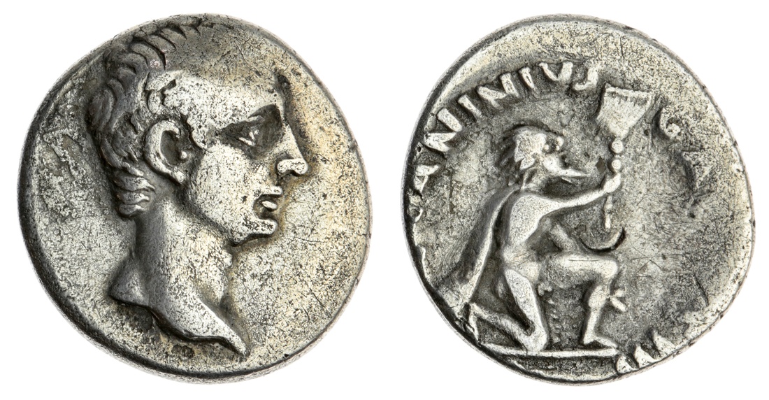 Roman Empire Augustus, 27BC-14AD, AR Denarius, Bust of Augustus right, rev. German kneeling, offering vexillium and extending left arm, [L C]ANINIVS GA[LLVS III VIR] in legend, 3.26g, (RIC I 416; BMCRE 127; RSC 383) fairly worn, slight porosity to surface, Very nice in hand, bankers mark to reverse, VF