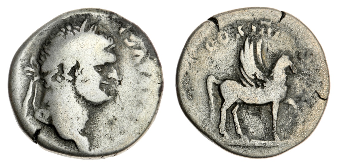 Roman Empire Domitian, As Caesar, under Vespasian, 69-79AD, AR Denarius, 76AD, Laureate Bust of Domitian right, rev. Pegasus standing right, left foreleg raised, COS IIII Above, 2.94g, (RIC II.1 921; BMCRE 193; RSC 47) heavily worn, 3 flan cracks to edge, good to fine