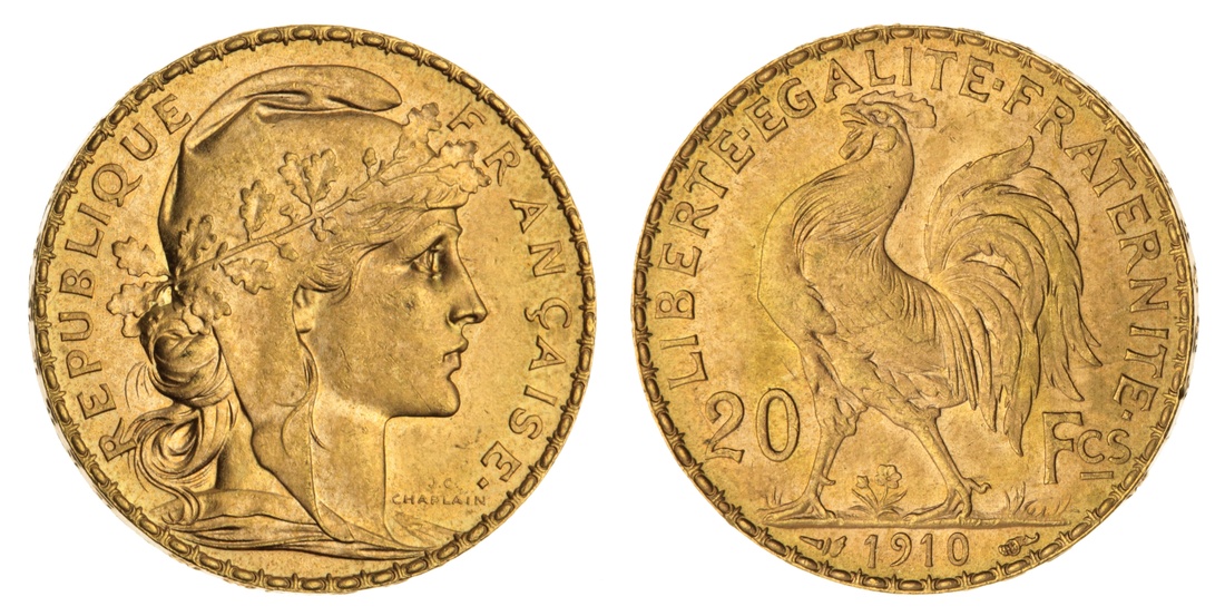 (g) France, Third Republic, Official Restrike Twenty Francs, 1910, Paris, security edge, 6h, 6.45g (Fr 596a; KM 857), a handful of very faint contact marks, otherwise with an attractive residual lustre and hints of red toning, near extremely fine