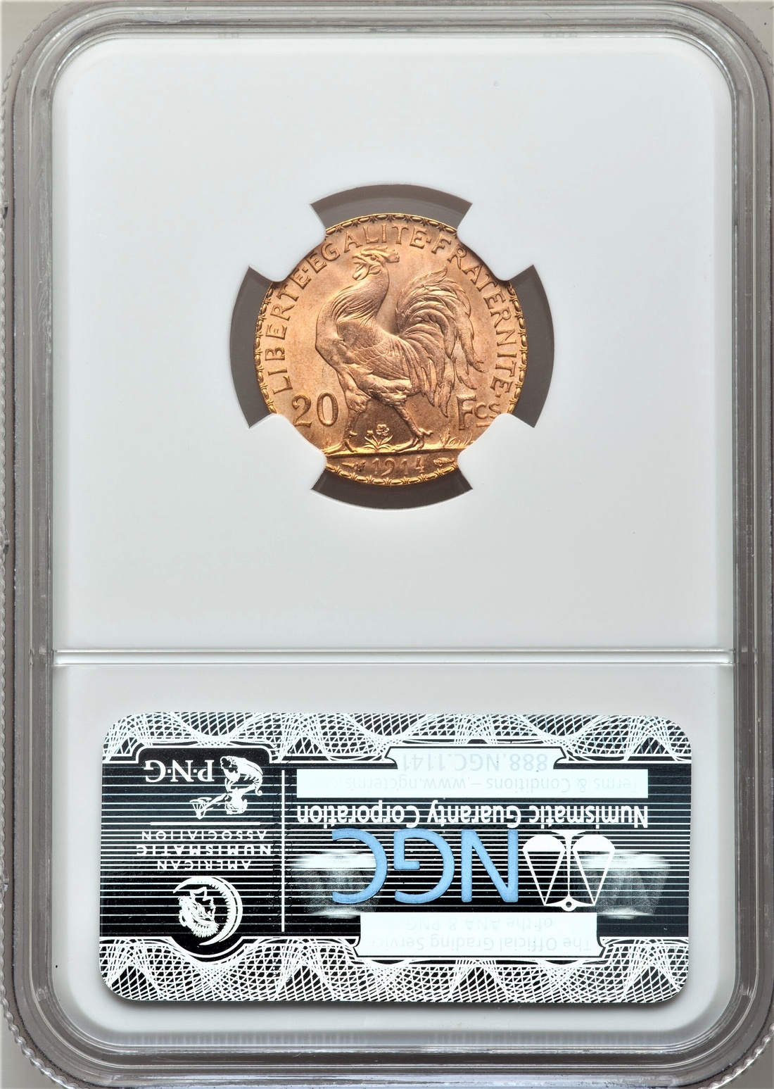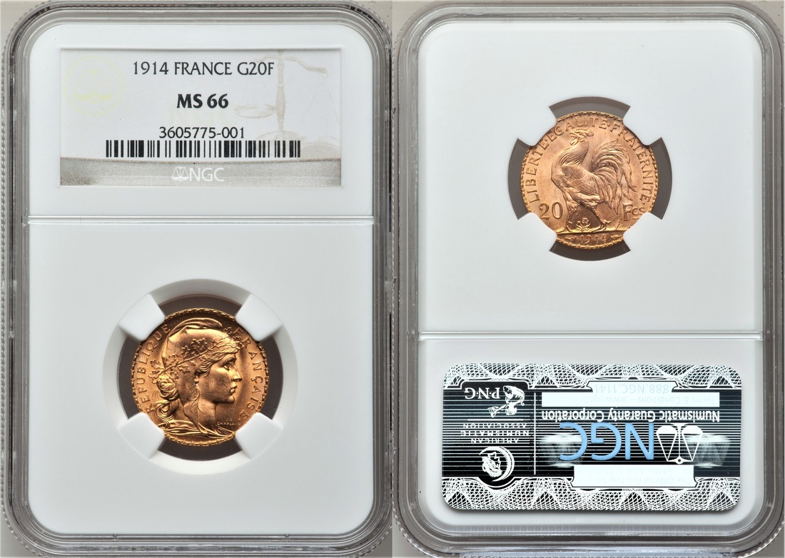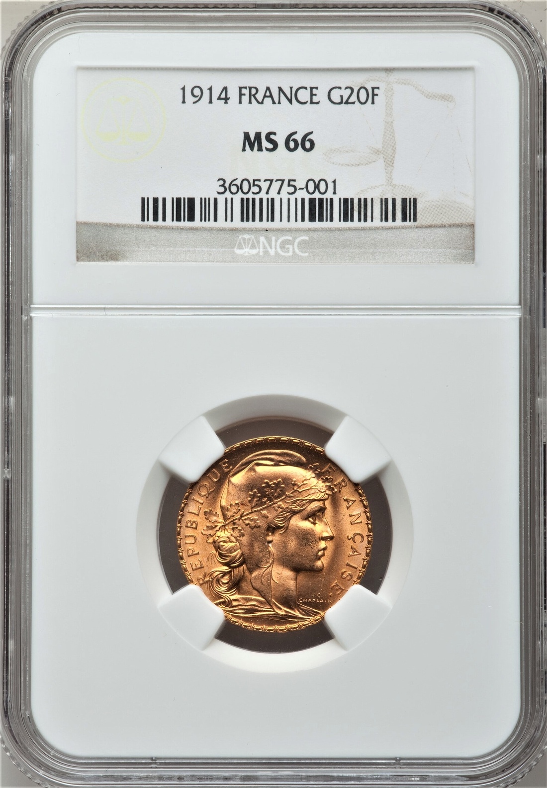 (g) NGC MS66 | France, Third Republic, Gold 20-Francs, 1914, Paris, security edge, 6.45g, 6h (Fb. 596a; KM 857), honey orange-tone overlying lustrous fields, choice mint state, in NGC holder, graded MS66 (#3605775-001)