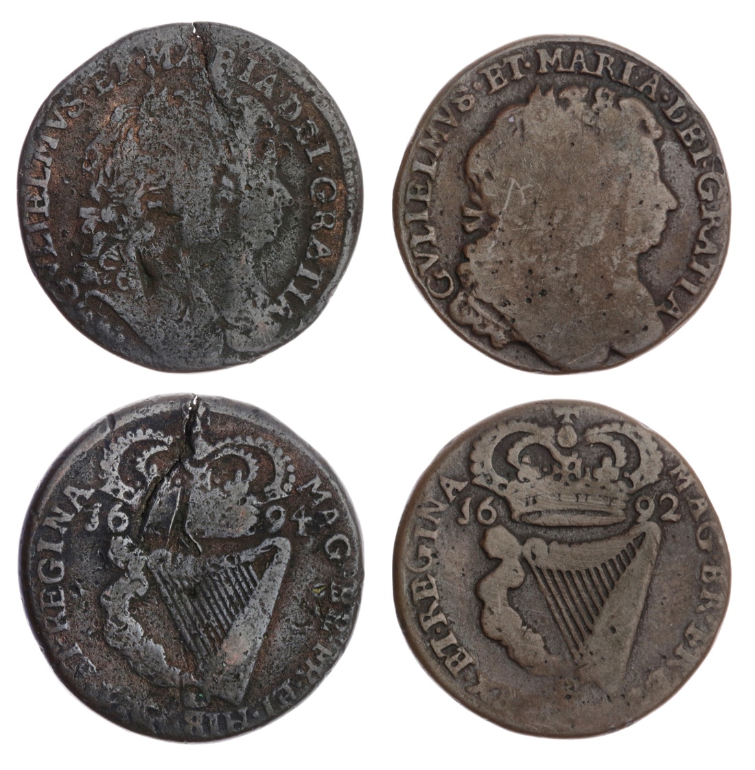 Ireland, William and Mary (1689-1694), Halfpenny, 1692, conjoined busts right, rev. crowned harp, plain edge, 12h, 6.63g (Spink 6597); Halfpenny, 1694, conjoined busts right, rev. crowned harp, plain edge, 12h, 7.03g (Spink 6597), die crack at 12 o'clock, pitted and with rusted surfaces, fine (2)