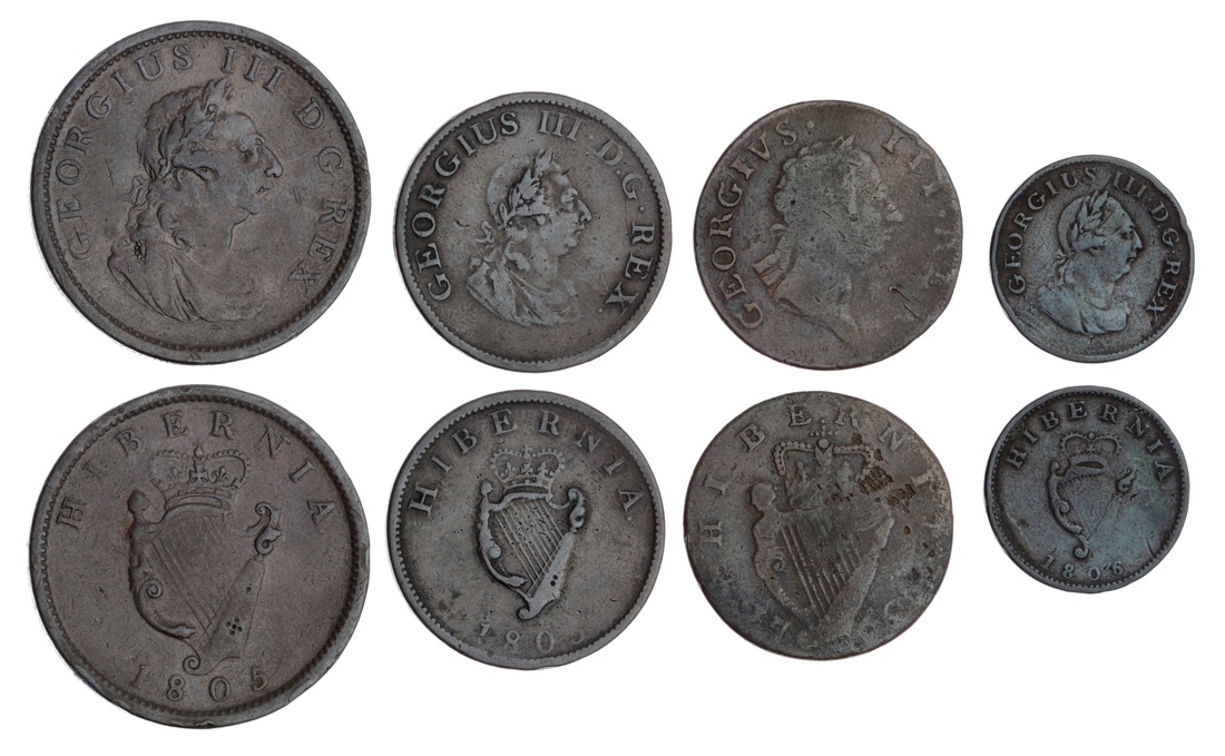 Ireland, George III (1760-1820), 'Soho' Penny, 1805, centre milled edge, 5h, 16.94g (Spink 6620); 'London' Halfpenny, Type I, 1669, plain edge, 6h, 6.92g (Spink 6612); 'Soho' Halfpenny, 1805, centre milled edge, 6h, 8.26g (Spink 6621); 'Soho' Farthing, 1806, centre milled edge, 5h, 4.19g (Spink 6622), all rubbed, fine, the Penny near very fine (4)