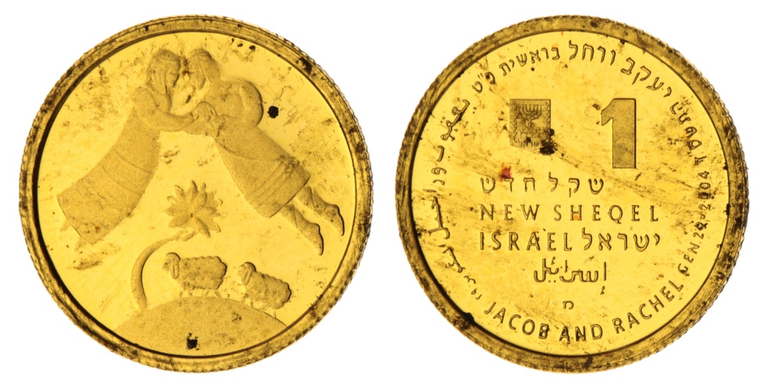 (g) Israel, New Sheqel, 2003, 'Jacob and Rachel', milled edge, 12h, 1.27g (Fr 85; KM 376-374), lightly fingermarked and with a spot of dark red toning to the reverse, otherwise brilliant, nearly as struck
