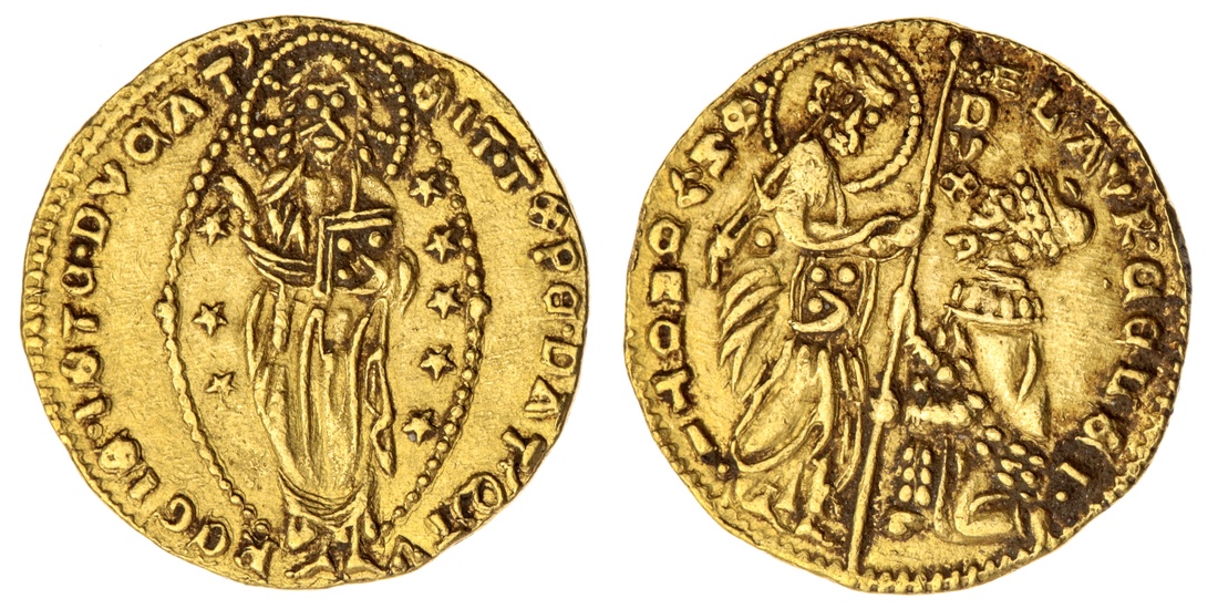 Venice, Lorenzo Celsi (1361-1365), Ducat, Doge kneeling before standing figure of St. Mark, DUX between, LAVR.CELSI S.M.VENETI In legend. rev Christ standing within asymmetrical stars SIT.T.XPE.DATQ.TV.REGIS.ISTE.DVCAT in legend, 3.54g, (Fb. 1225 ; CNI Pl. iii, no.29), 8 stars instead of usual 9+, possibly unlisted variety, minor earthen deposits around legend of obverse and Christs face on reverse, about extremely fine