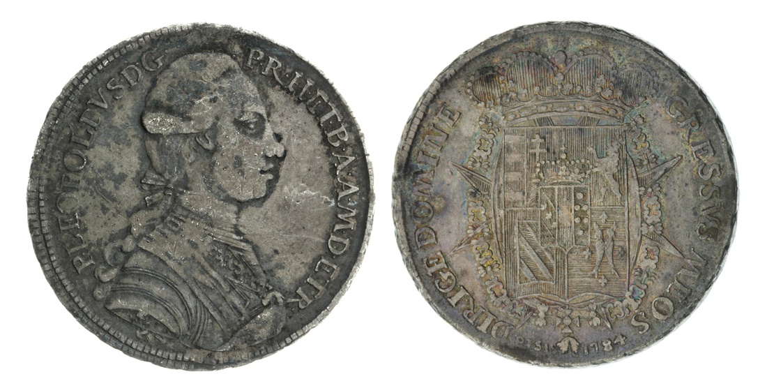 Italy, Tuscany, Pietro Leopoldo I (1765-1790), Francescone of 10 Paoli, 1784, Pisa, draped bust right, rev. crowned arms, security edge, 6h, 27.03g (KM C# 24.3), the obverse with darkened surfaces and flat in parts, yet the reverse pleasingly toned, very fine