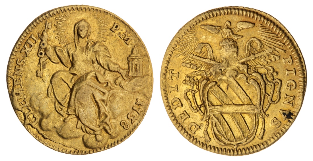 Italy, Papal States, Clement XII (1730-1740), Zecchino, 1738, seated figure in clouds, rev. Papal arms, radiant dove above, plain edge, 12h, 3.34g (KM 888), hairline die flaw to the obverse field from 6 to 9 o'clock, otherwise very fine
