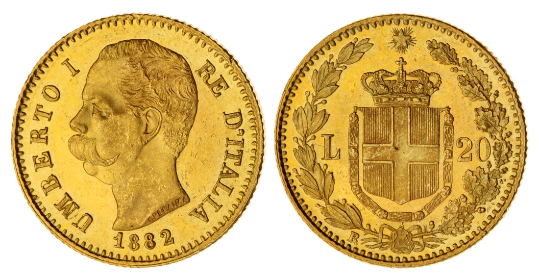 (g) Italy, Umberto I (1878-1900), 20 Lire, 1882 R, Rome, bare head left, rev. crowned shield within wreath, milled edge, 6h, 6.44g (Fr 21; KM 21), a scattering of small nailmarks to otherwise proof-like surfaces, about extremely fine
