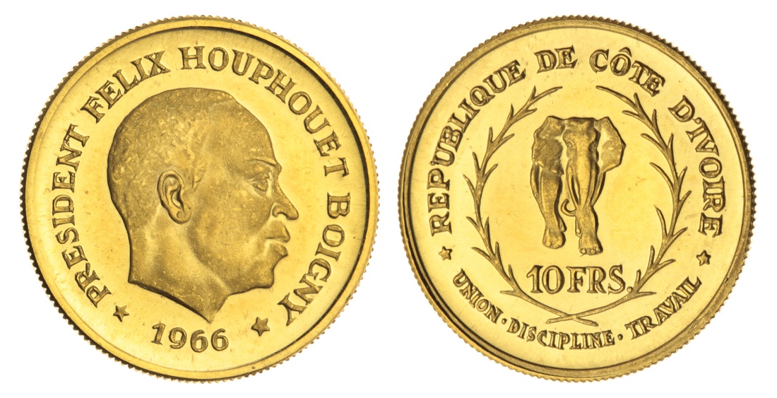 (g) Ivory Coast, Proof Ten Francs, 1966, milled edge, 6h, 3.18g (Fr 4; KM 2), a couple of pin marks to otherwise brilliant fields, almost as struck