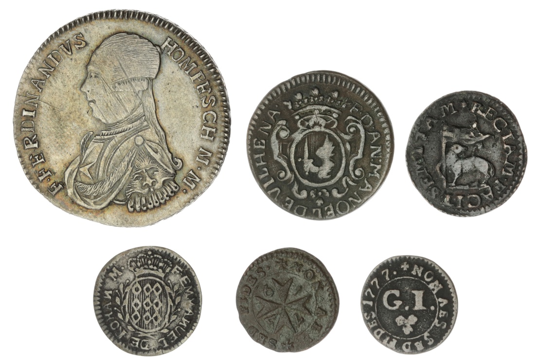 Malta, Knights of St John (6) | Raymond Perellos y Roccaul (1697-1720), Grano, 1709 (KM 140); Antonio Manoel de Vilhena (1722-1736), 10 Grani, 1734 (KM 200); Emmanual de Rohan (1755-1797), Tari, 1777 (KM 307.1); Grano (KM 298.1); Grano, 1777 (KM 298.2); Ferdinand Hompesch (1797-1798), 15 Tari, 1798 (KM 344), the copper mostly very fine, the Tari, fine, the 15 Tari with adjustment marks, yet toned, very fine (6)