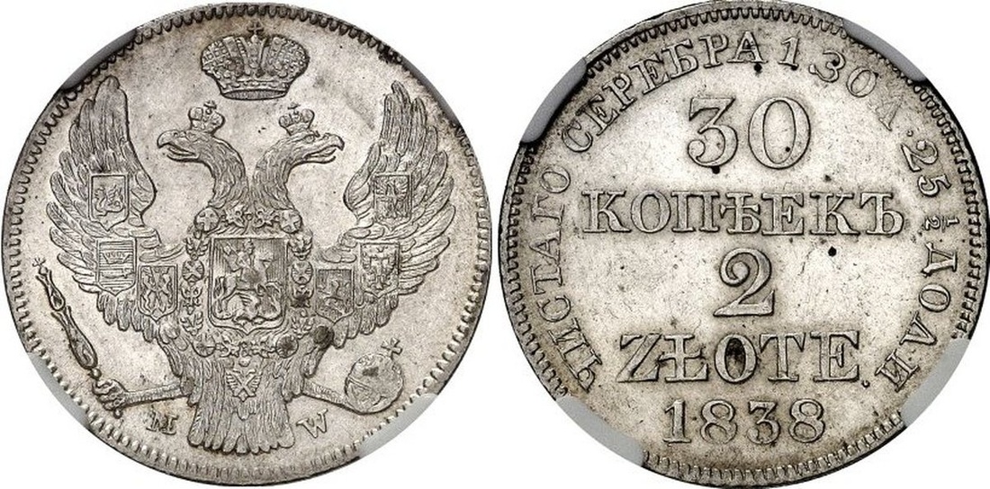 (Tsarist) Russia, Nicholas I Pávlovich (1825-1855), 30-Kopeks - 2 Zloty, 1838-MW, Warsaw, crowned double-headed eagle, rev. value, incuse edge graining, 20.37g, 12h (Sev. 3262; Uzd. 4140; Diakov 272; Bitkin 1156), lightly wiped on reverse otherwise lustrous and frosty, much as issued, in NGC holder, graded AU Details ~ Surface Hairlines (Cert. 3500899-005)
