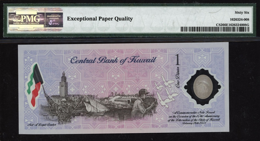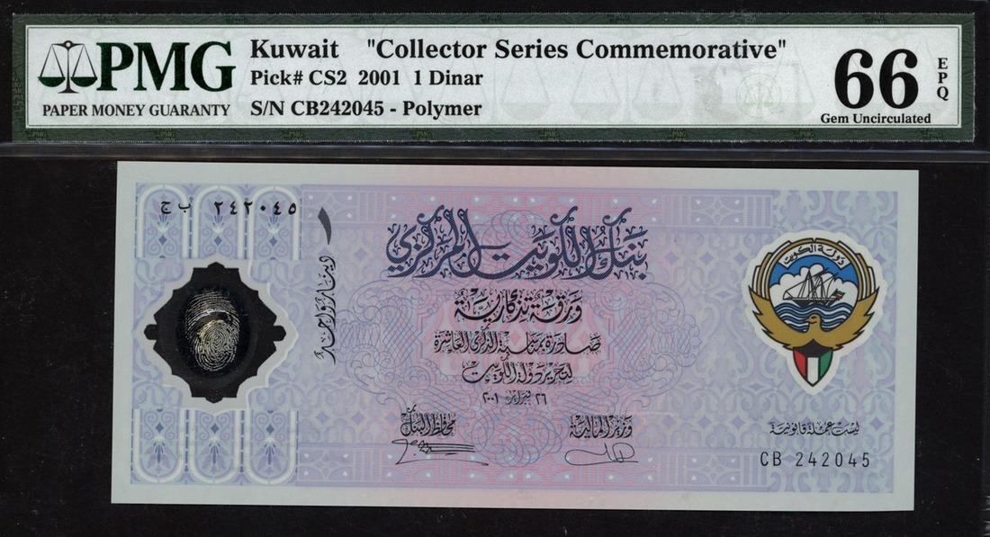 (x) Central Bank of Kuwait "Collector Series Commemorative", 1 dinar, 2001, serial number CB242045, (Pick CS2), in PMG holder 66 EPQ Gem Uncirculated