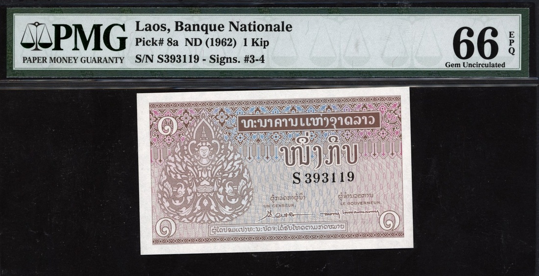 (x) Banque Nationale, Laos, 1 kip, ND (1962), serial number S393119, (Pick 8a), in PMG holder 66 EPQ Gem Uncirculated