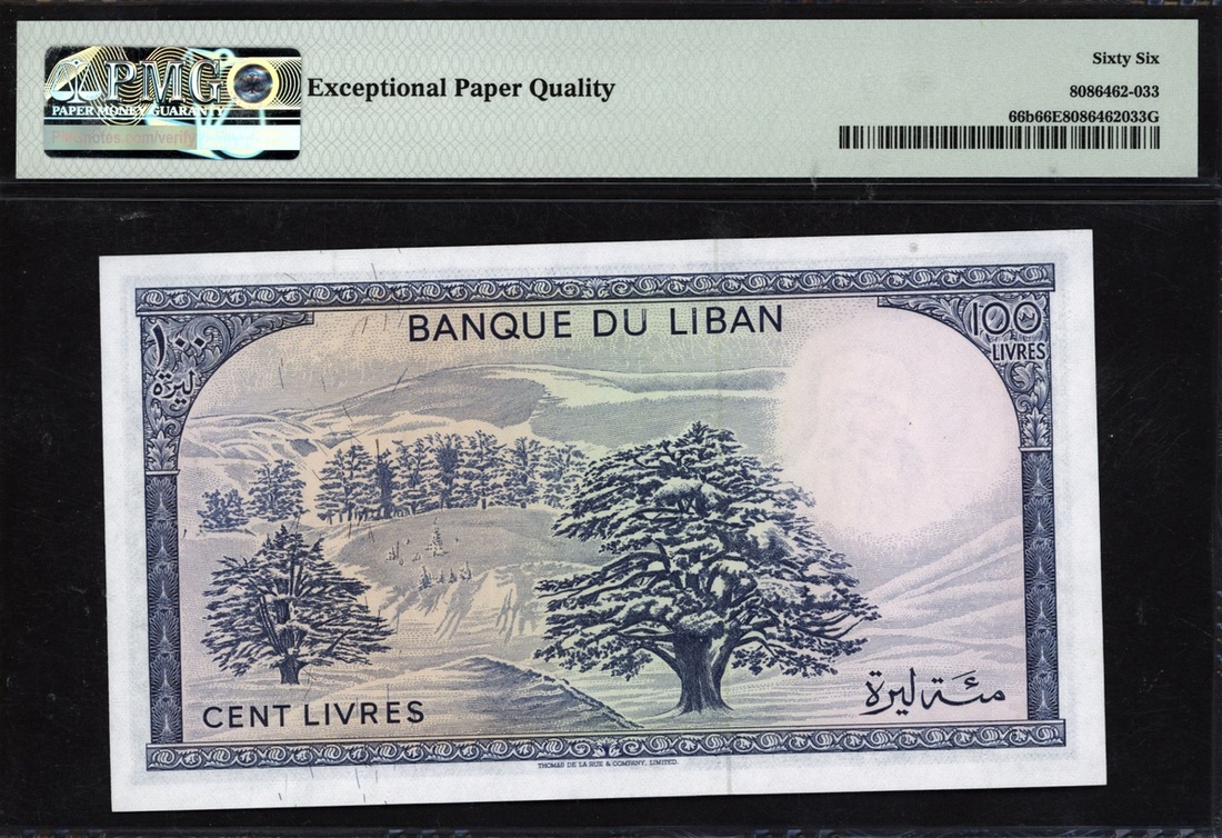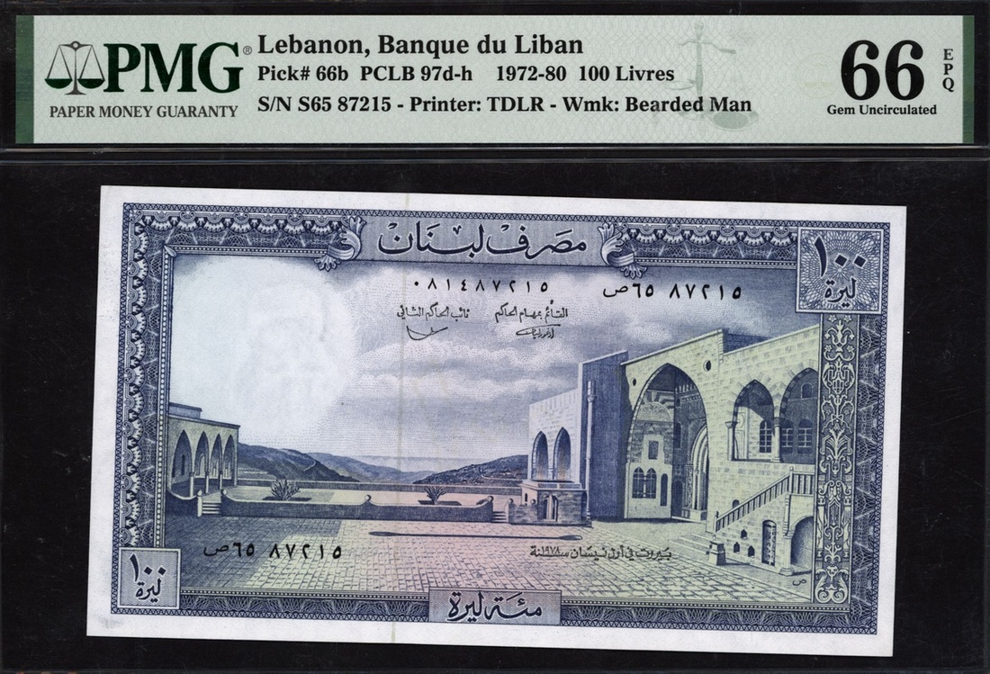 (x) Banque du Liban, Lebanon, 100 livres, 1972-80, serial number S65 87215, (Pick 66b), in PMG holder 66 EPQ Gem Uncirculated