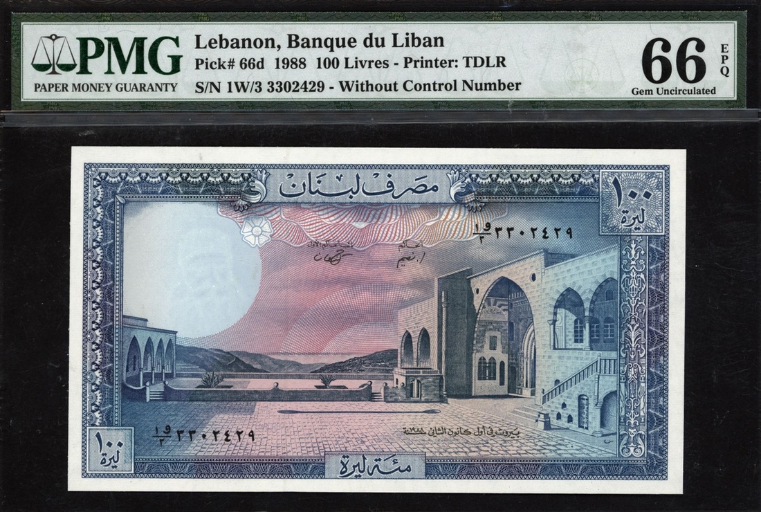 (x) Banque du Liban, Lebanon, 100 livres, 1988, serial number 1W/3 3302429, (Pick 66d), in PMG holder 66 EPQ Gem Uncirculated