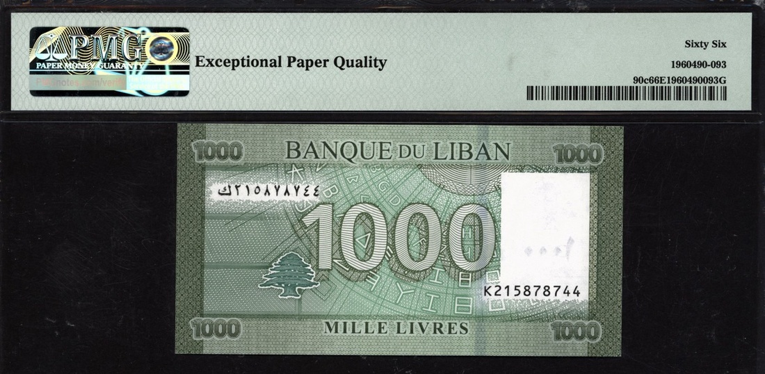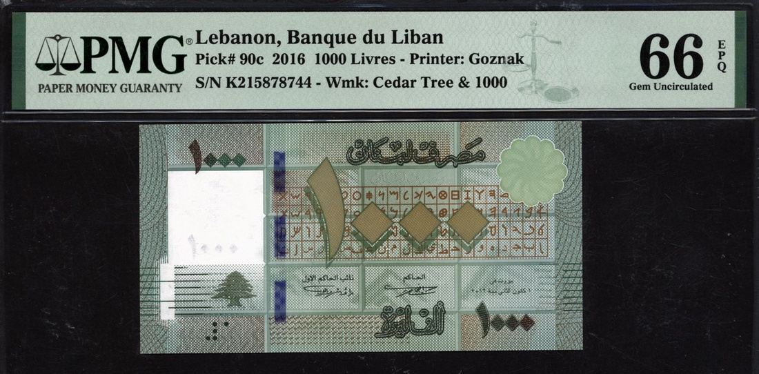 (x) Banque du Liban, Lebanon, 1000 livres, 2016, serial number K215878744, (Pick 90c), in PMG holder 66 EPQ Gem Uncirculated