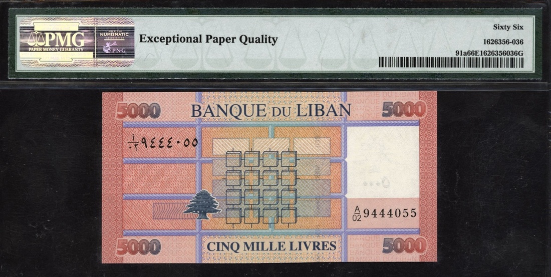 (x) Banque du Liban, Lebanon, 5000 livres, 2012, serial number A/02 9444055, (Pick 91a), in PMG holder 66 EPQ Gem Uncirculated