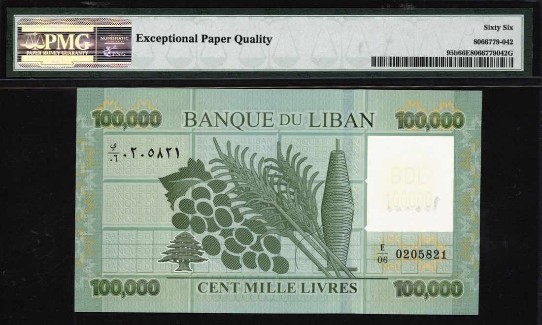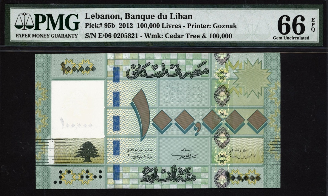 (x) Banque du Liban, Lebanon, 100,000 livres, 2012, serial number E/06 0205821, (Pick 95b), in PMG holder 66 EPQ Gem Uncirculated