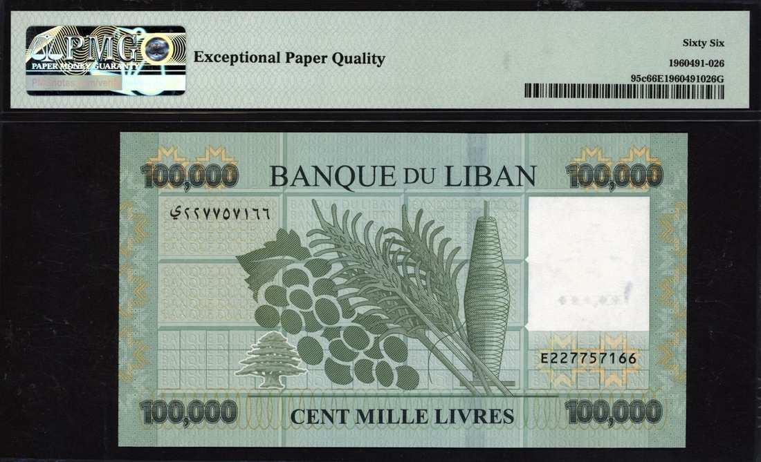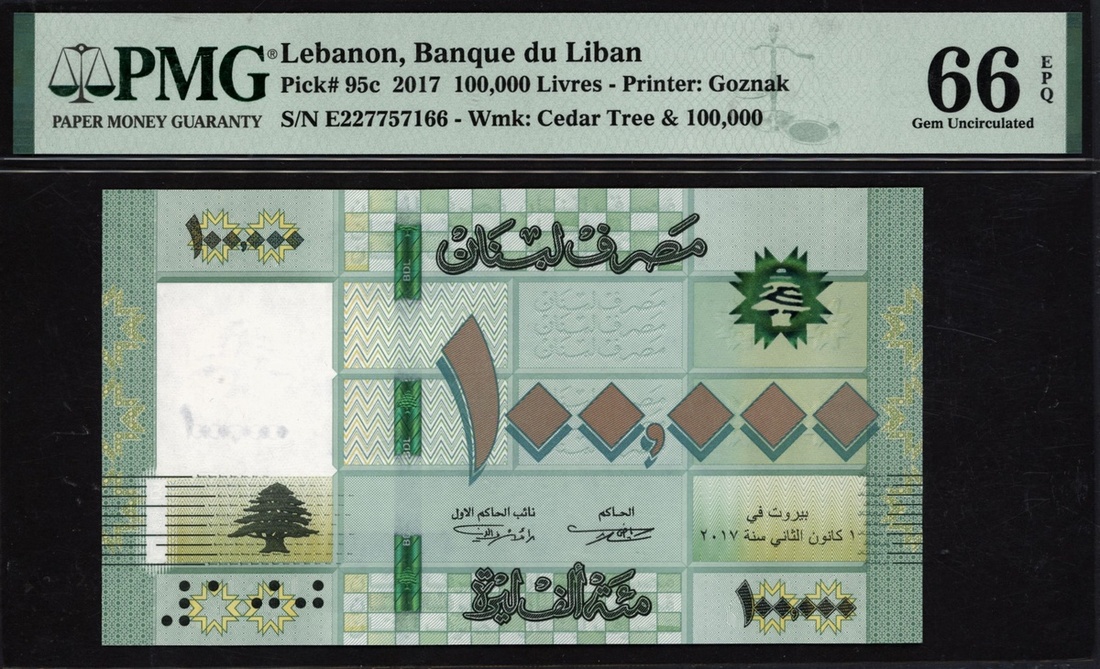 (x) Banque du Liban, Lebanon, 100,000 livres, 2017, serial number E227757166, (Pick 95c), in PMG holder 66 EPQ Gem Uncirculated