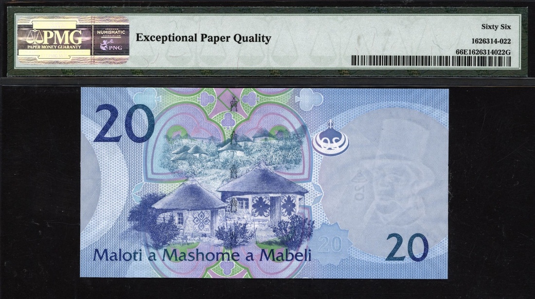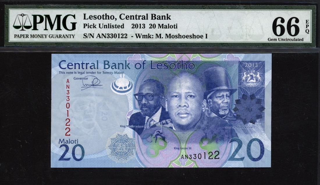 (x) Central Bank of Lesotho, 20 maloti, 2013, serial number AN330122, (Pick Unlisted), in PMG holder 66 EPQ Gem Uncirculated