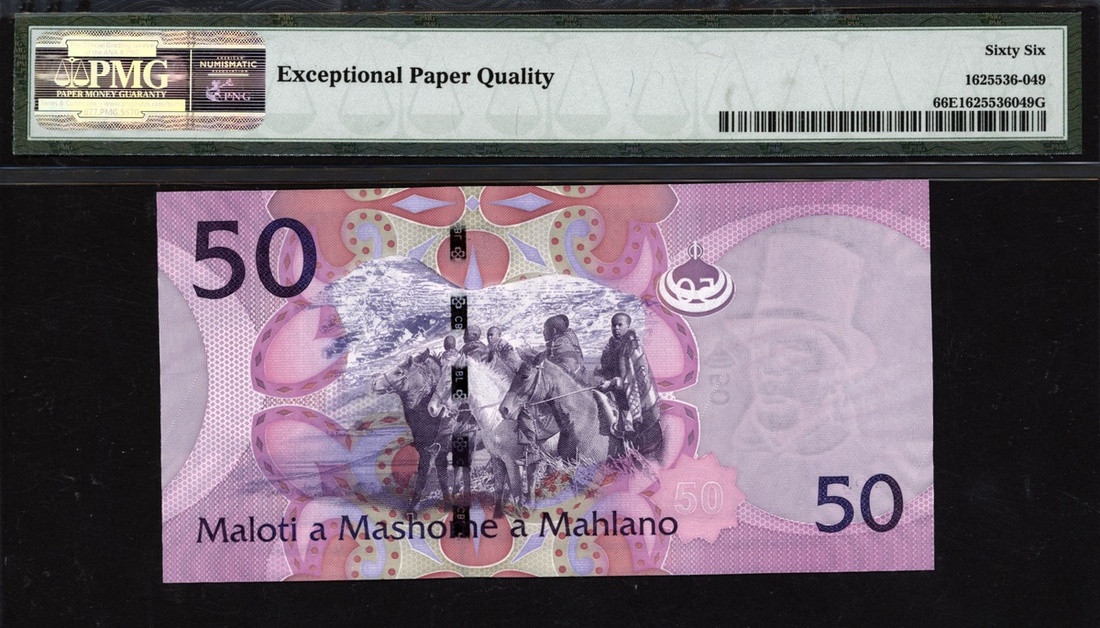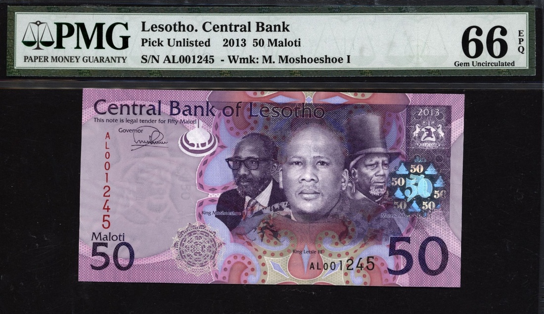 (x) Central Bank of Lesotho, 50 maloti, 2013, serial number AL001245, (Pick Unlisted), in PMG holder 66 EPQ Gem Uncirculated