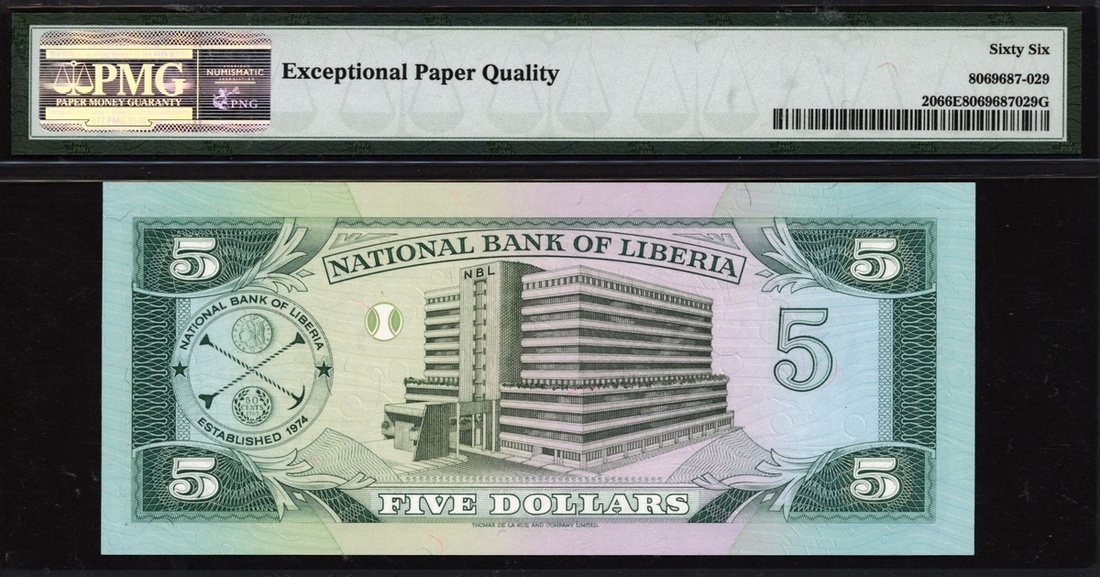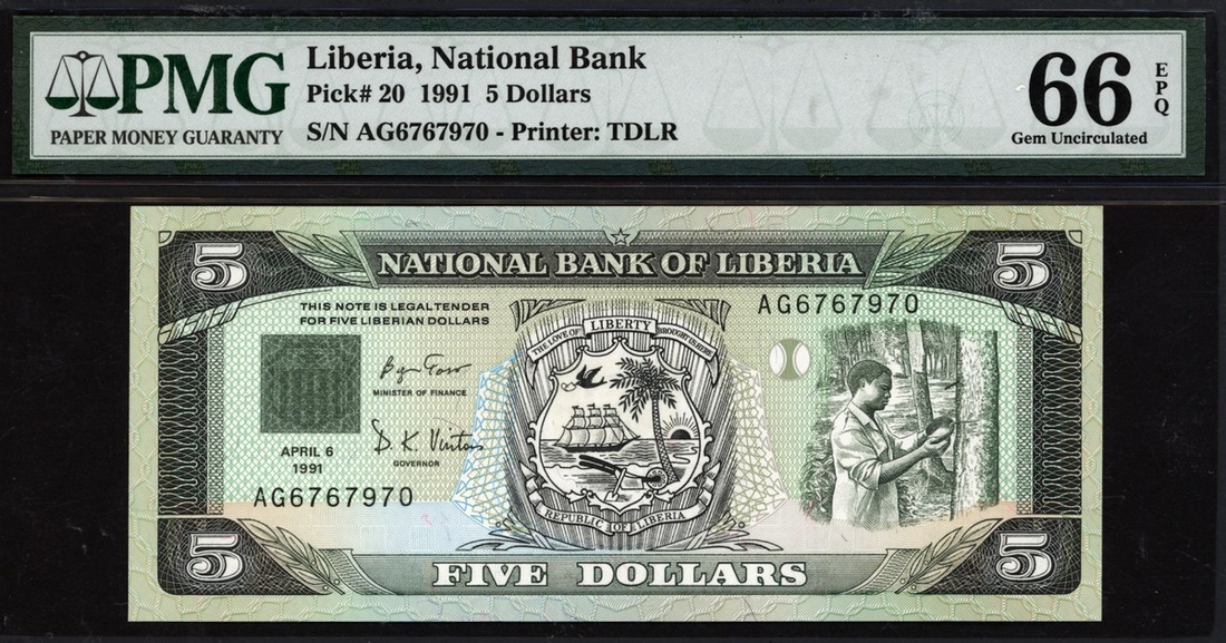(x) National Bank of Liberia, 5 dollars, 1991, serial number AG6767970, (Pick 20), in PMG holder 66 EPQ Gem Uncirculated