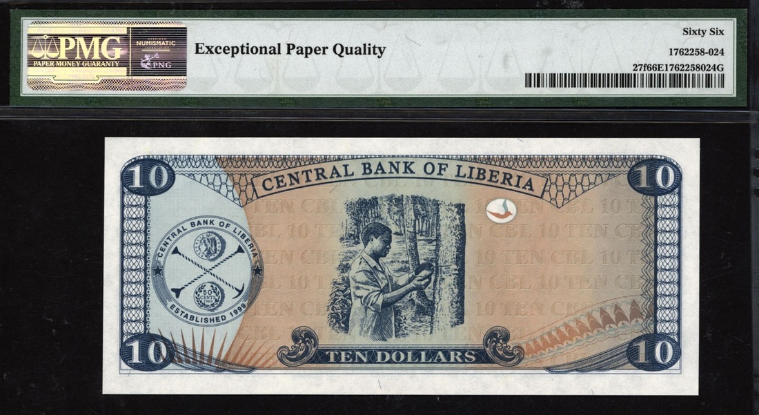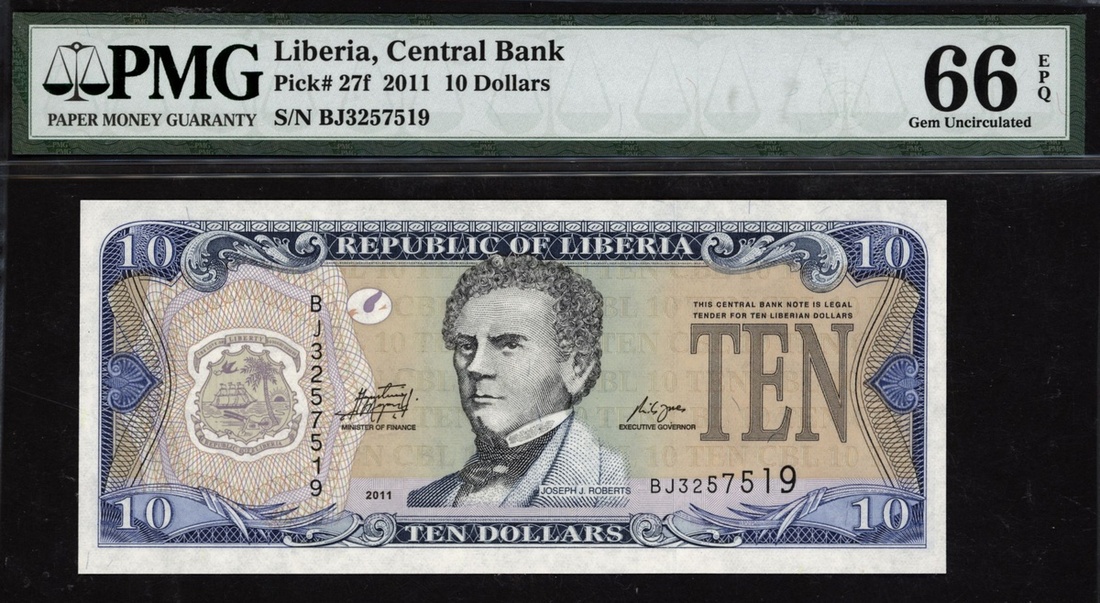 (x) Central Bank of Liberia, 10 dollars, 2011, serial number BJ3257519, (Pick 27f), in PMG holder 66 EPQ Gem Uncirculated
