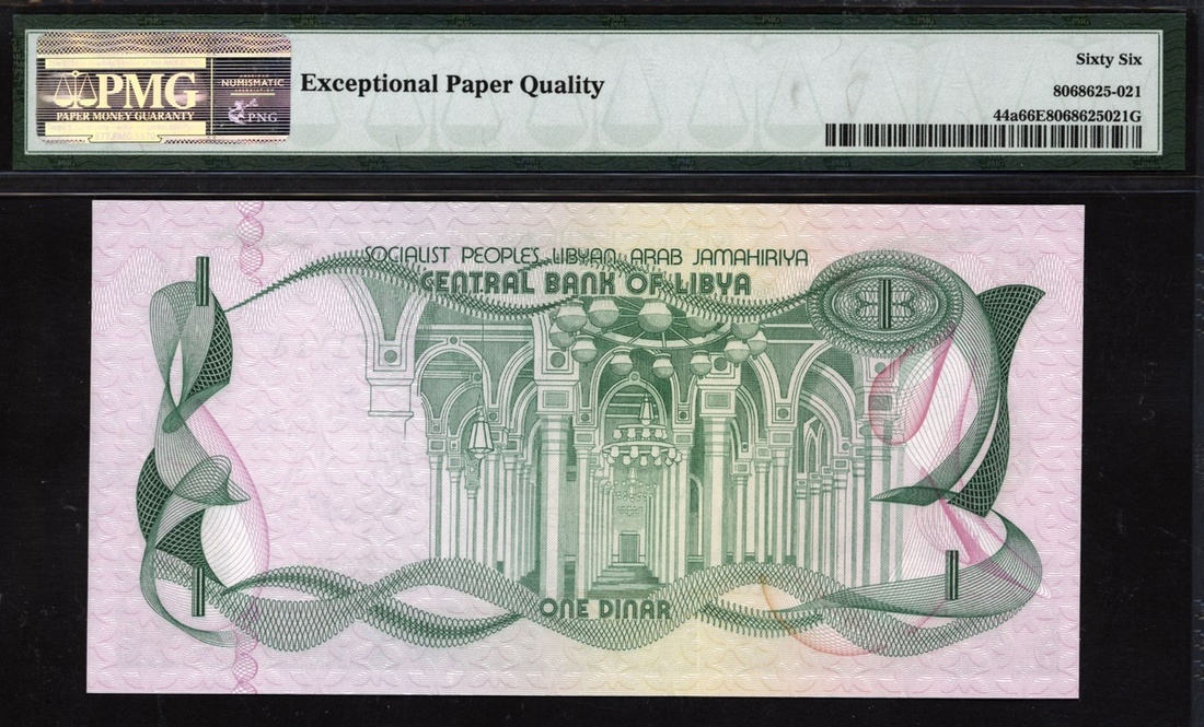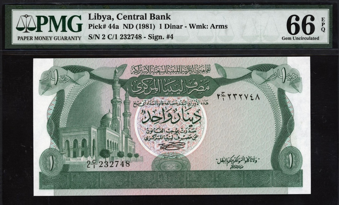 (x) Central Bank, Libya, 1 dinar, ND (1981), serial number 2 C/1 232748, (Pick 44a), in PMG holder 66 EPQ Gem Uncirculated
