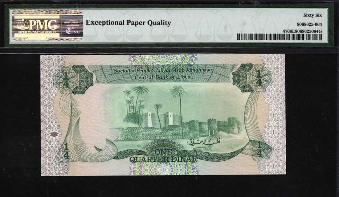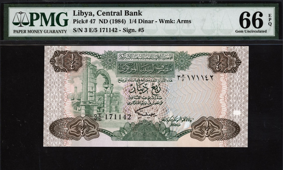 (x) Central Bank, Libya, 1/4 dinar, ND (1984), serial number 3 E/5 171142, (Pick 47), in PMG holder 66 EPQ Gem Uncirculated