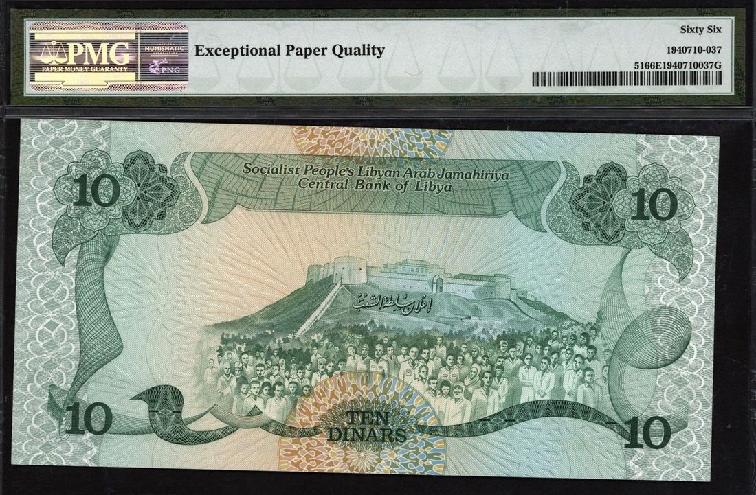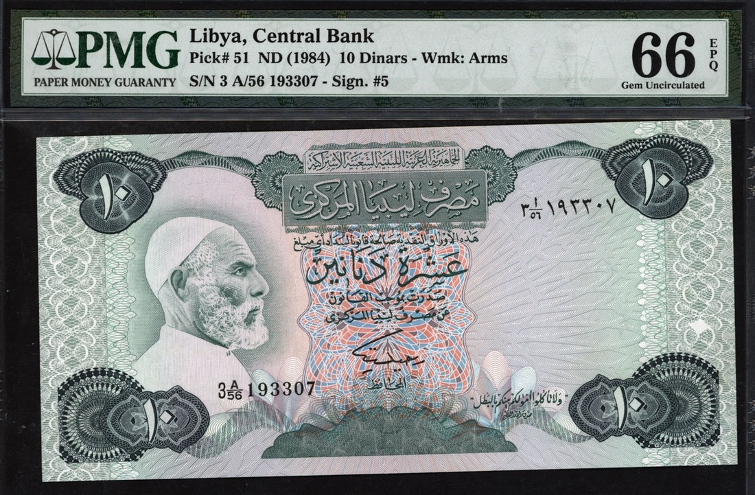 (x) Central Bank, Libya, 10 dinars, ND (1984), serial number 3 A/56 193307, (Pick 51), in PMG holder 66 EPQ Gem Uncirculated