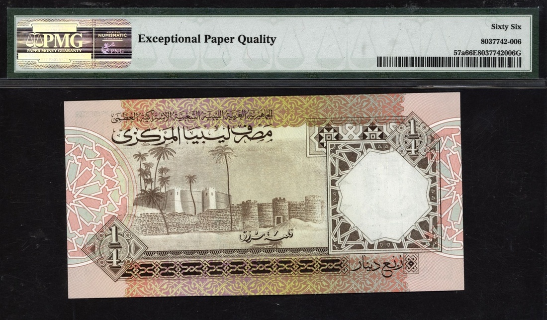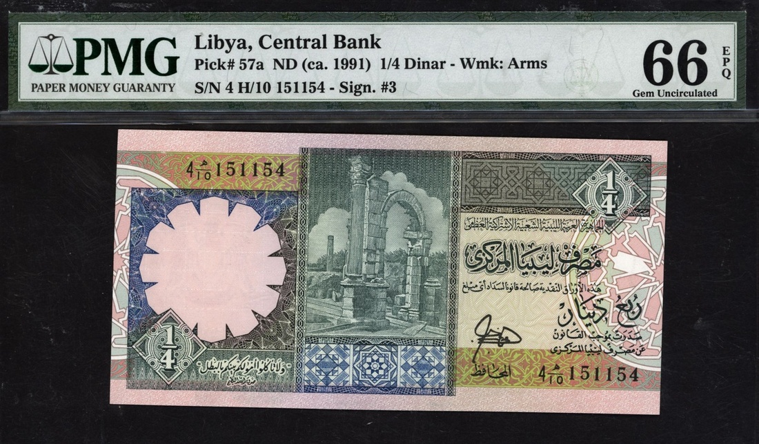 (x) Central Bank, Libya, 1/4 dinar, ND (ca.1991), serial number 4 H/10 151154, (Pick 57a), in PMG holder 66 EPQ Gem Uncirculated