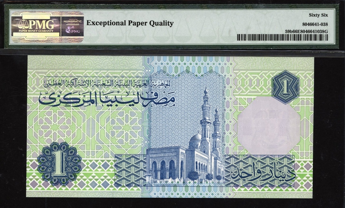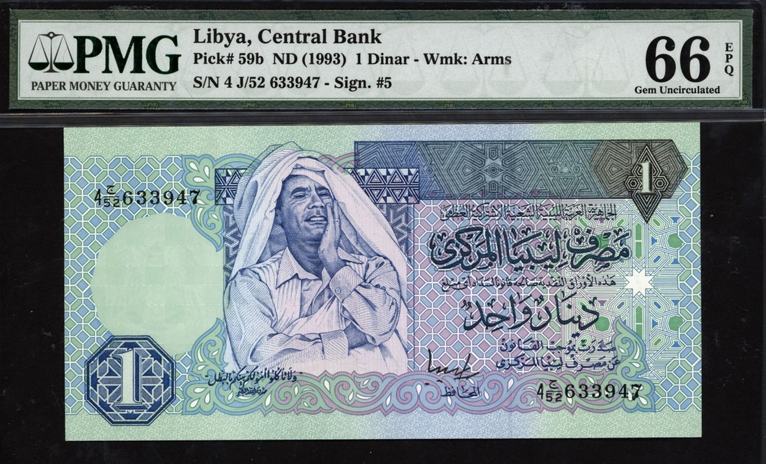 (x) Central Bank, Libya, 1 dinar, ND (1993), serial number 4 J/52 633947, (Pick 59b), in PMG holder 66 EPQ Gem Uncirculated