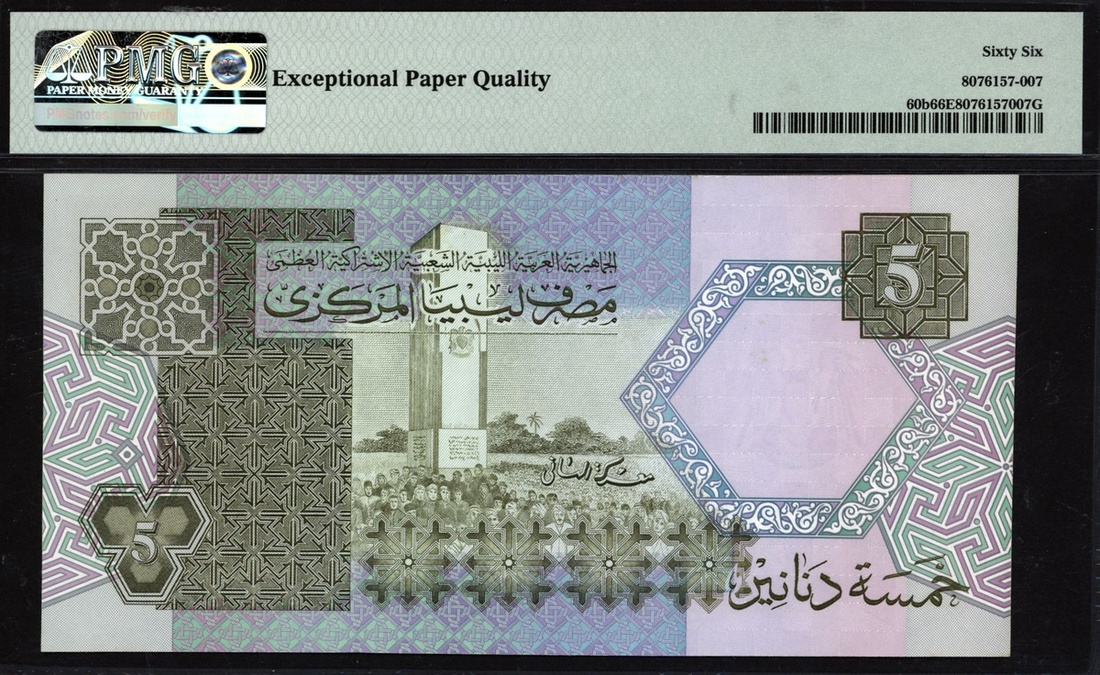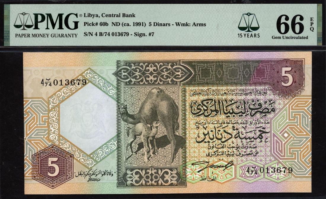 (x) Central Bank, Libya, 5 dinars, ND (ca.1991), serial number 4 B/74 013679, (Pick 60b), in PMG holder 66 EPQ Gem Uncirculated