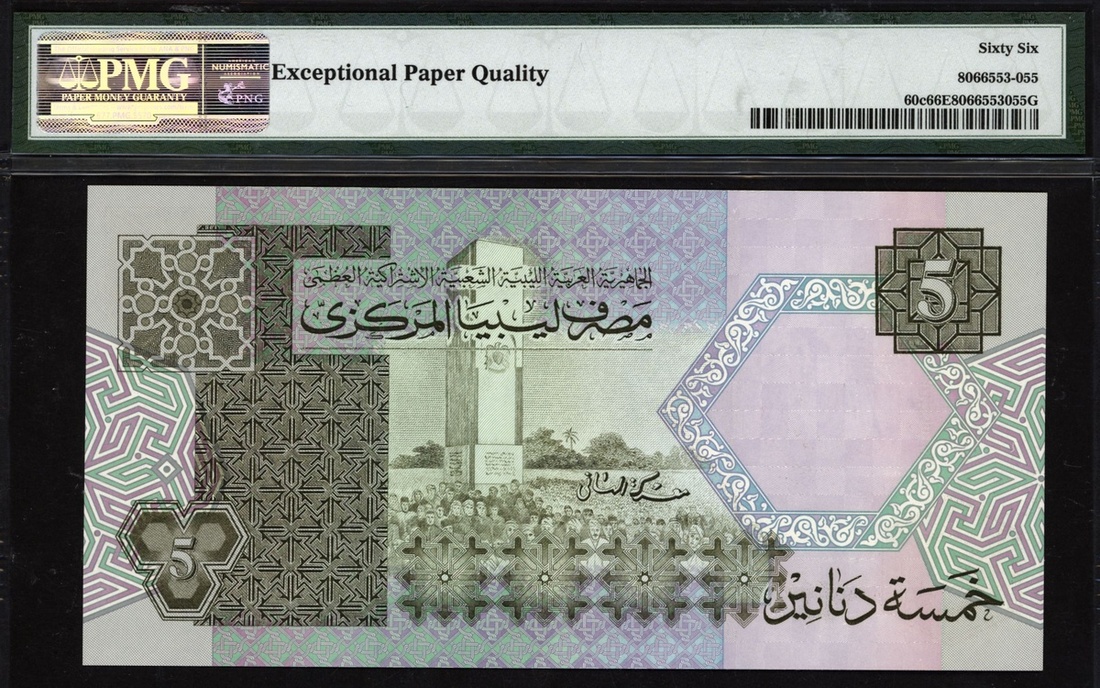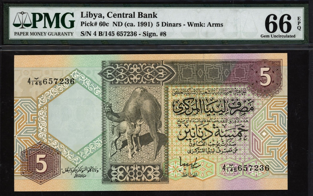 (x) Central Bank, Libya, 5 dinars, ND (ca. 1991), serial number 4 B/145 657236, (Pick 60c), in PMG holder 66 EPQ Gem Uncirculated