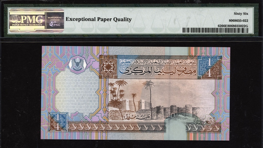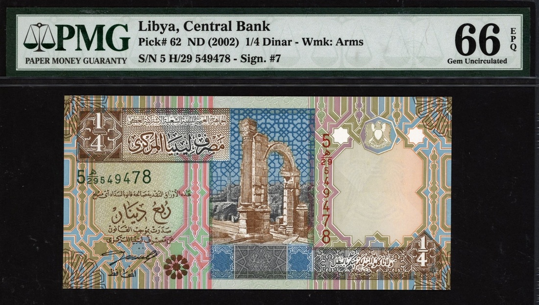 (x) Central Bank, Libya, 1/4 dinar, ND (2002), serial number 5 H/29 549478, (Pick 62), in PMG holder 66 EPQ Gem Uncirculated