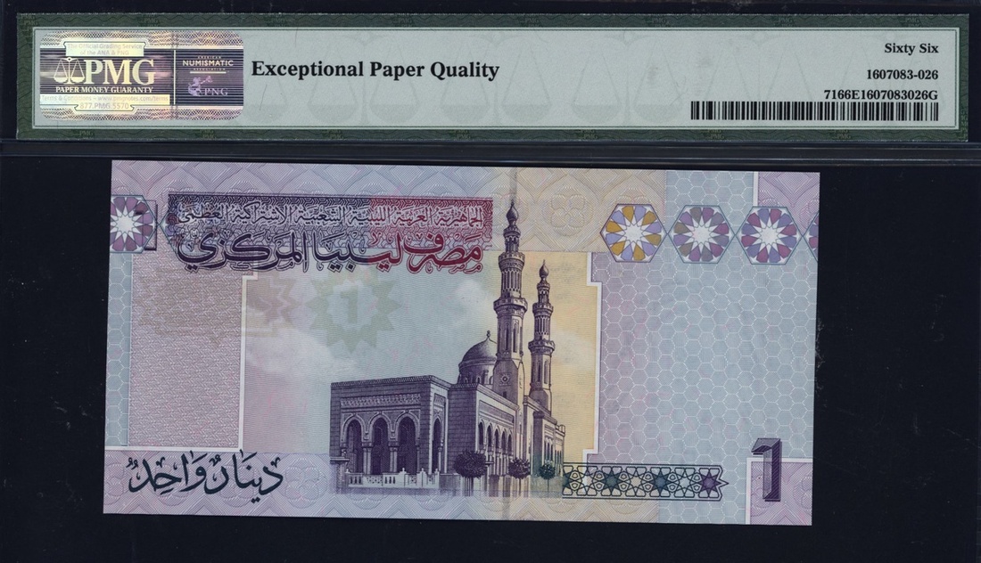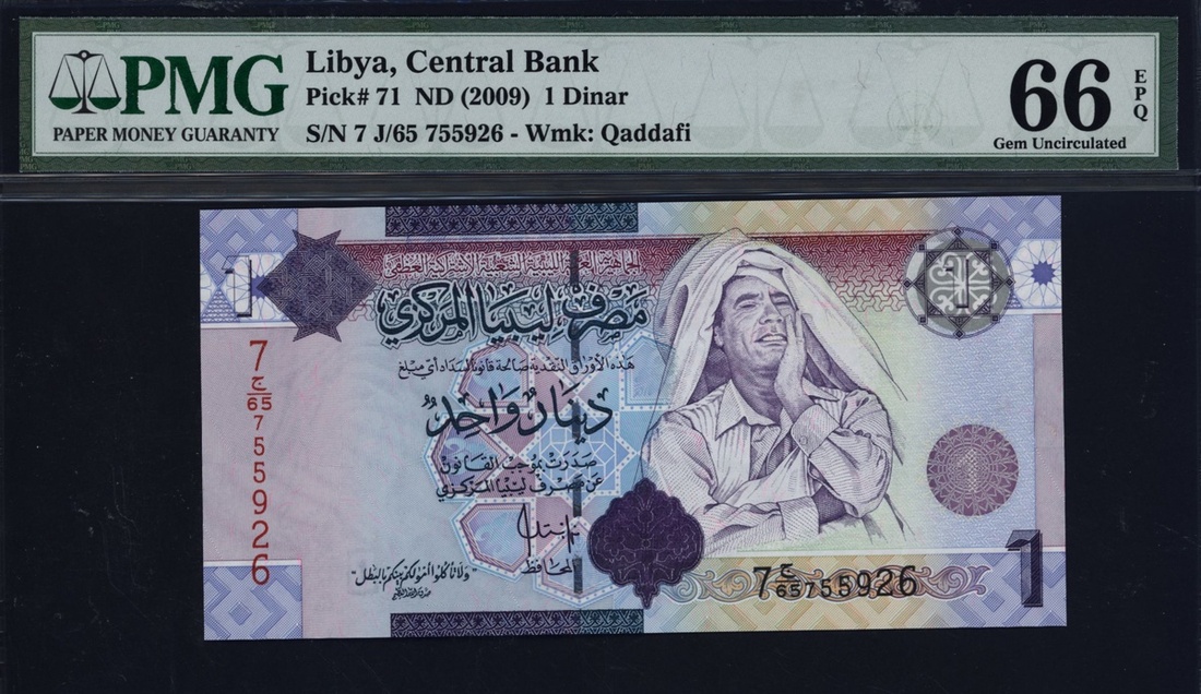 (x) Central Bank, Libya, 1 dinar, ND (2009), serial number 7 J/65 755926, (Pick 71), in PMG holder 66 EPQ Gem Uncirculated