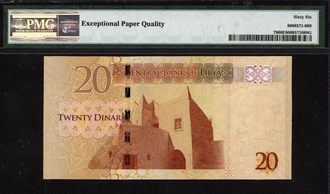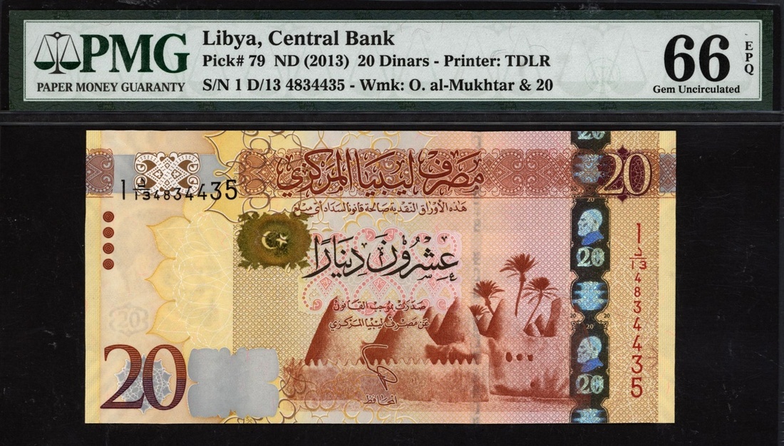 (x) Central Bank, Libya, 20 dinars, ND (2013), serial number 1 D/13 4834435, (Pick 79), in PMG holder 66 EPQ Gem Uncirculated