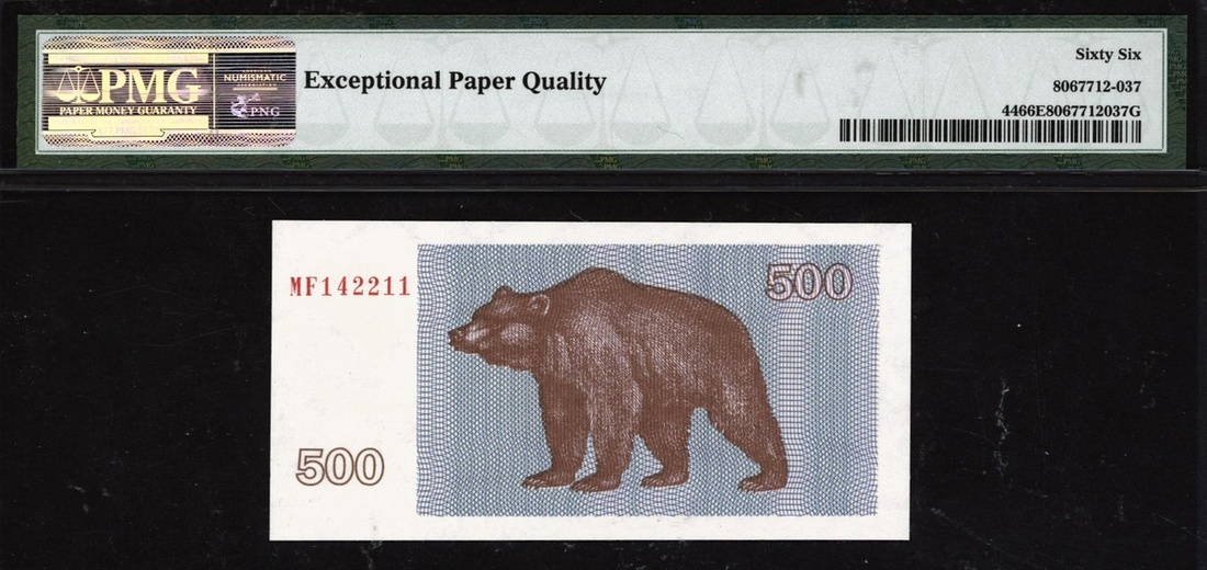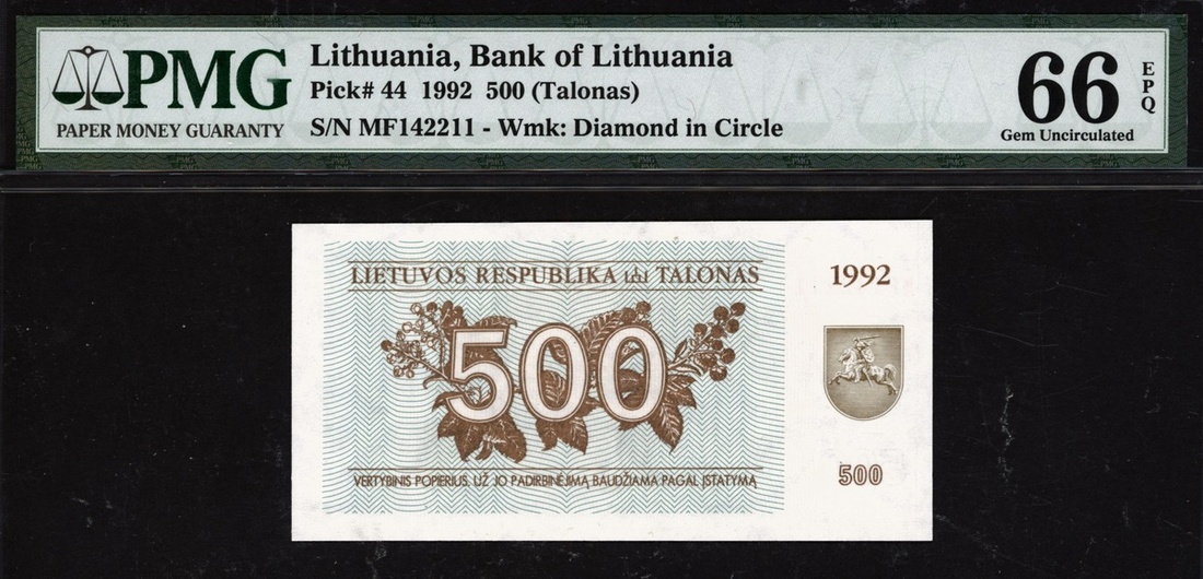 (x) Bank of Lithuania, 500 talonas, 1992, serial number MF142211, (Pick 44), in PMG holder 66 EPQ Gem Uncirculated