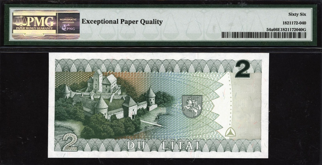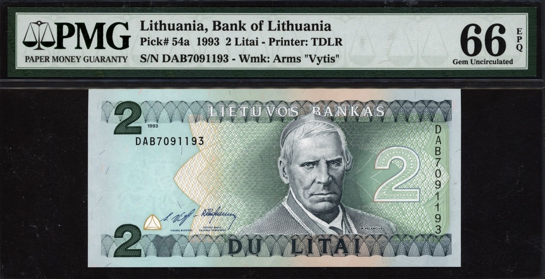 (x) Bank of Lithuania, 2 litai, 1993, serial number DAB7091193, (Pick 54a), in PMG holder 66 EPQ Gem Uncirculated