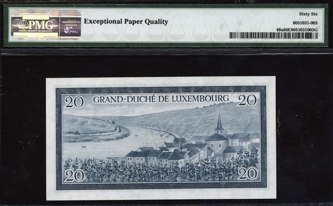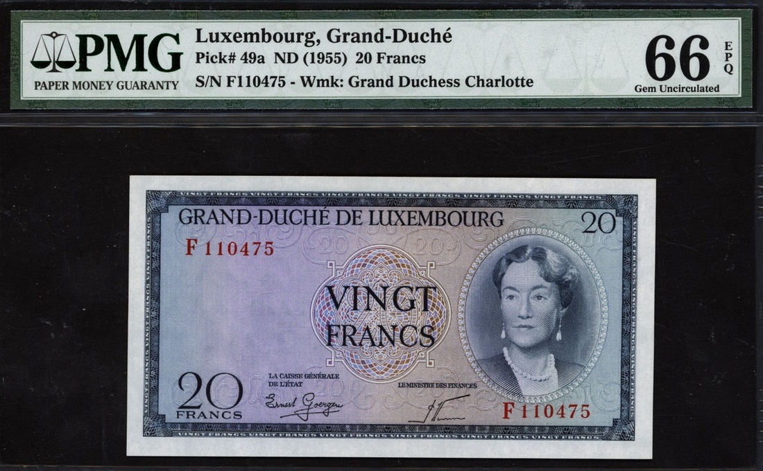 (x) Grand Duche de Luxembourg, 20 francs, ND (1955), serial number F110475, (Pick 49a), in PMG holder 66 EPQ Gem Uncirculated