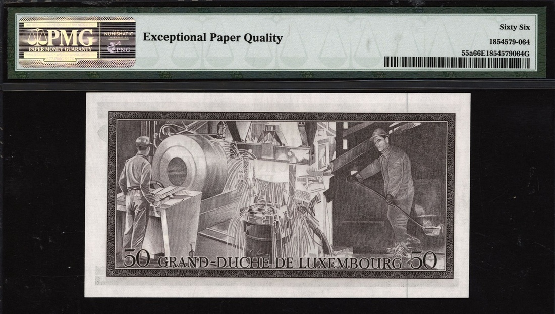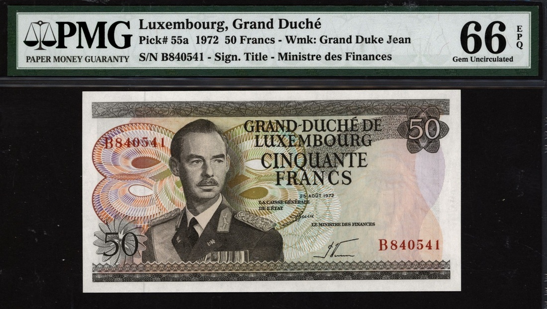 (x) Grand Duche de Luxembourg, 50 francs, 1972, serial number B840541, (Pick 55a), in PMG holder 66 EPQ Gem Uncirculated