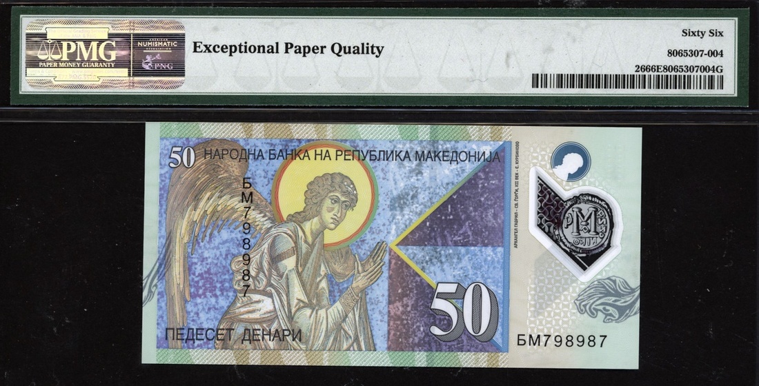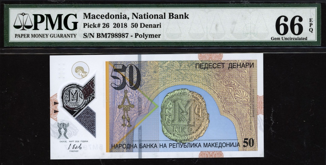 (x) National Bank of Macedonia, 50 denari, 2018, serial number BM 798987, (Pick 26), in PMG holder 66 EPQ Gem Uncirculated