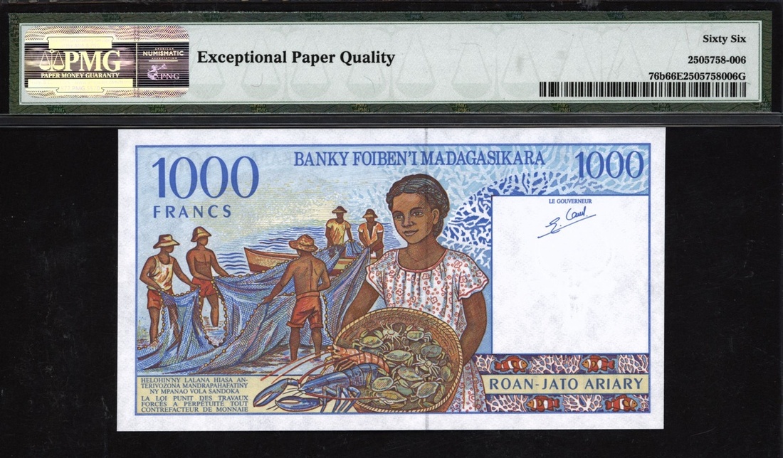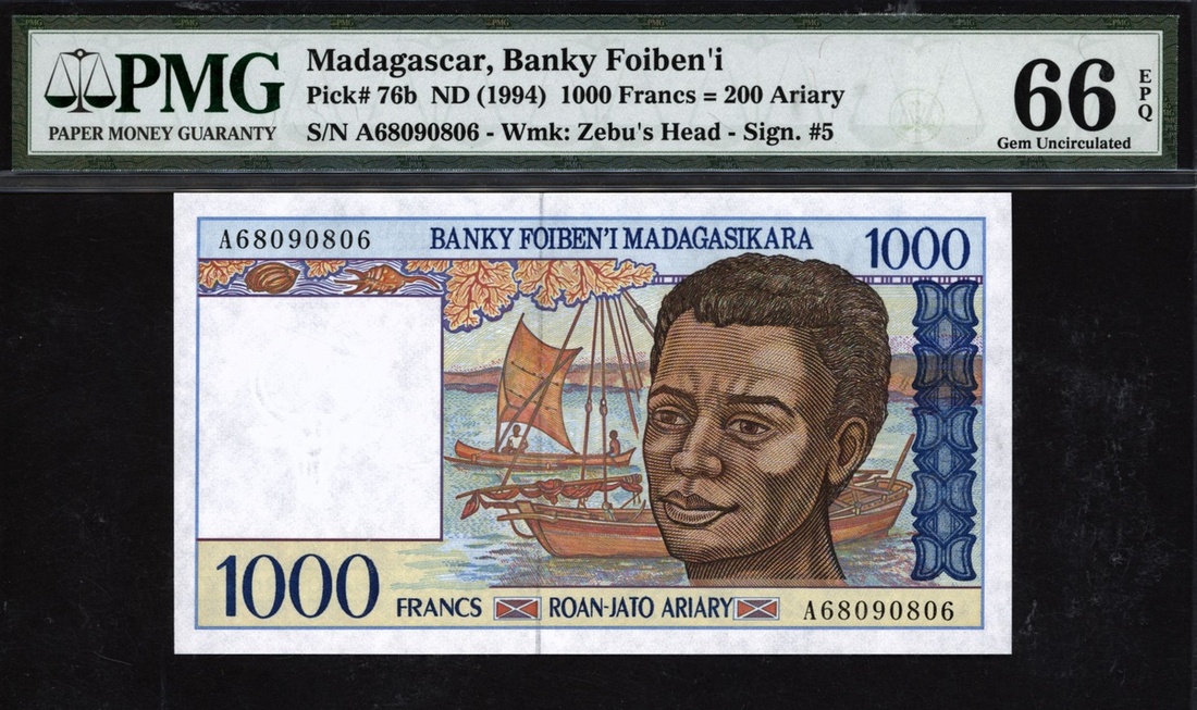(x) Banky Foiben'i, Madagascar, 1000 francs = 200 ariary, ND (1994), serial number A68090806, (Pick 76b), in PMG holder 66 EPQ Gem Uncirculated