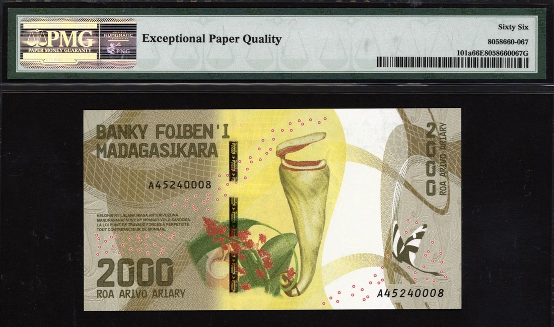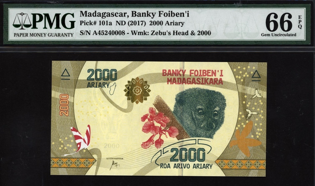 (x) Banky Foiben'i, Madagascar, 2000 ariary, ND (2017), serial number A45240008, (Pick 101a), in PMG holder 66 EPQ Gem Uncirculated