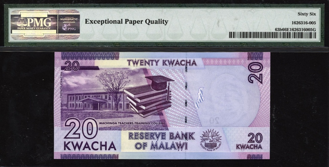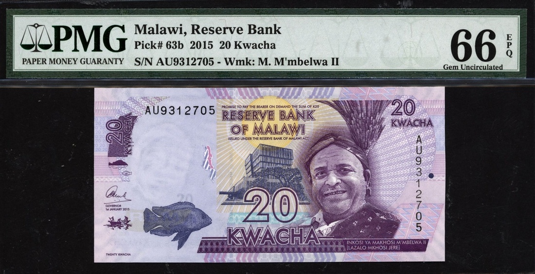 (x) Reserve Bank, Malawi, 20 kwacha, 2015, serial number AU9312705, (Pick 63b), in PMG holder 66 EPQ Gem Uncirculated