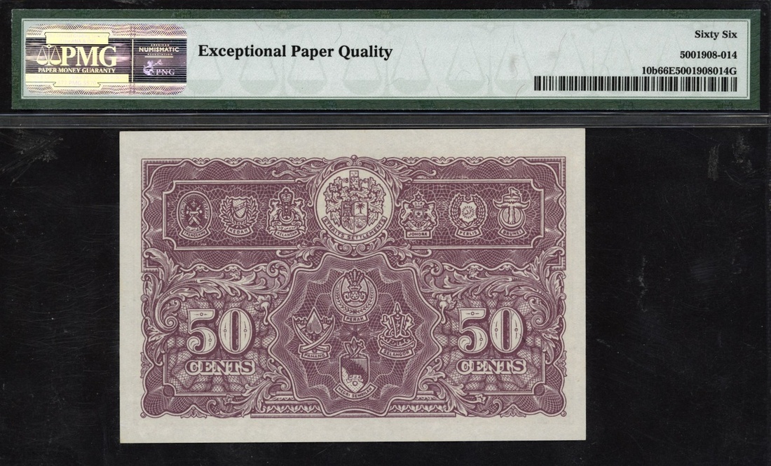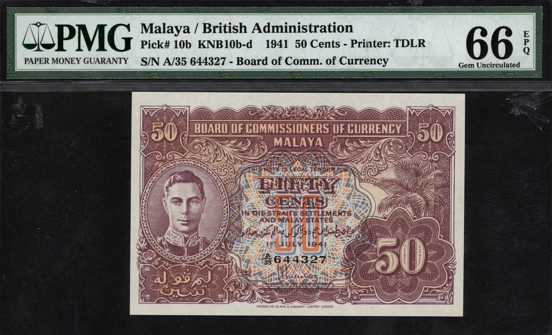 (x) Malaya / British Administration, 50 cents, 1941, serial number A/35 644327, (Pick 10b), in PMG holder 66 EPQ Gem Uncirculated