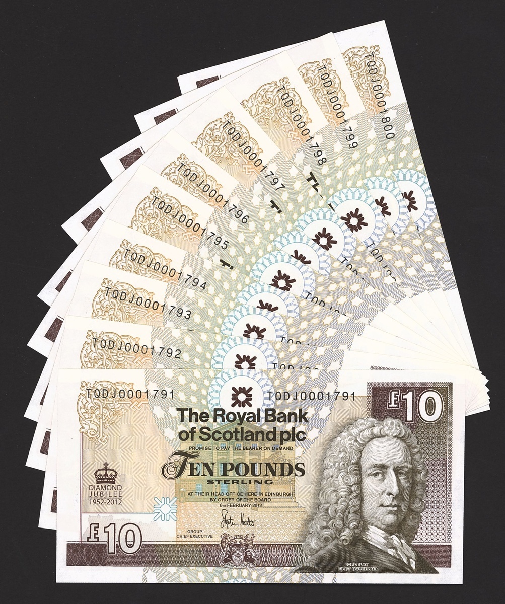 Royal Bank of Scotland, £10, 6 February 2012, serial number TQDJ0001791-1800, Lord Ilay First Governor of the Royal Bank of Scotland at right, reverse, four intaglio portraits of the Queen, showing her at different stages in her life