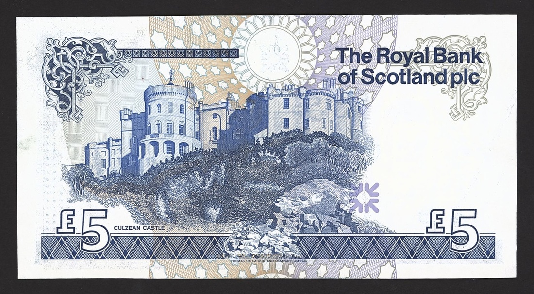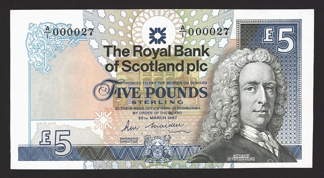 Royal Bank of Scotland, £5, 25 March 1987, serial number A/1 000027, Lord Ilay First Governor of the Royal Bank of Scotland at right, reverse, Culzean Castle