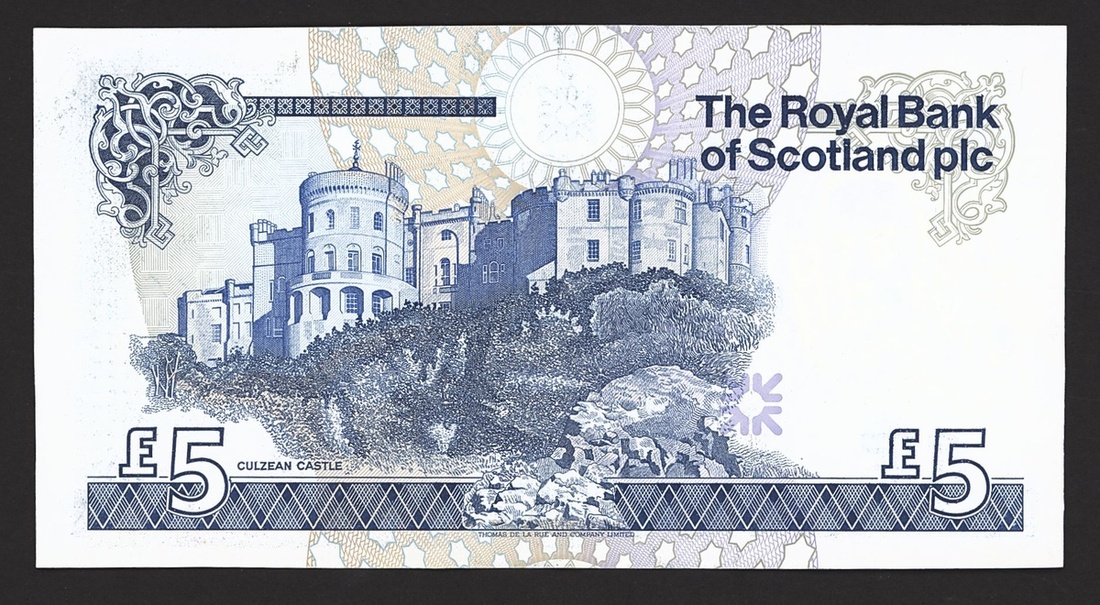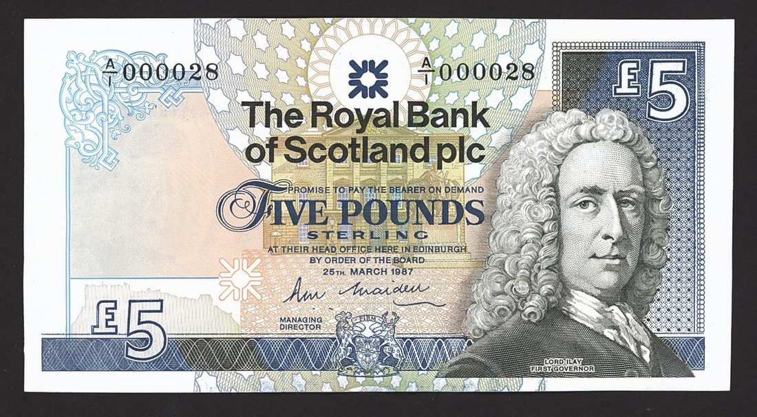 Royal Bank of Scotland, £5, 25 March 1987, serial number A/1 000028, Lord Ilay First Governor of the Royal Bank of Scotland at right, reverse, Culzean Castle