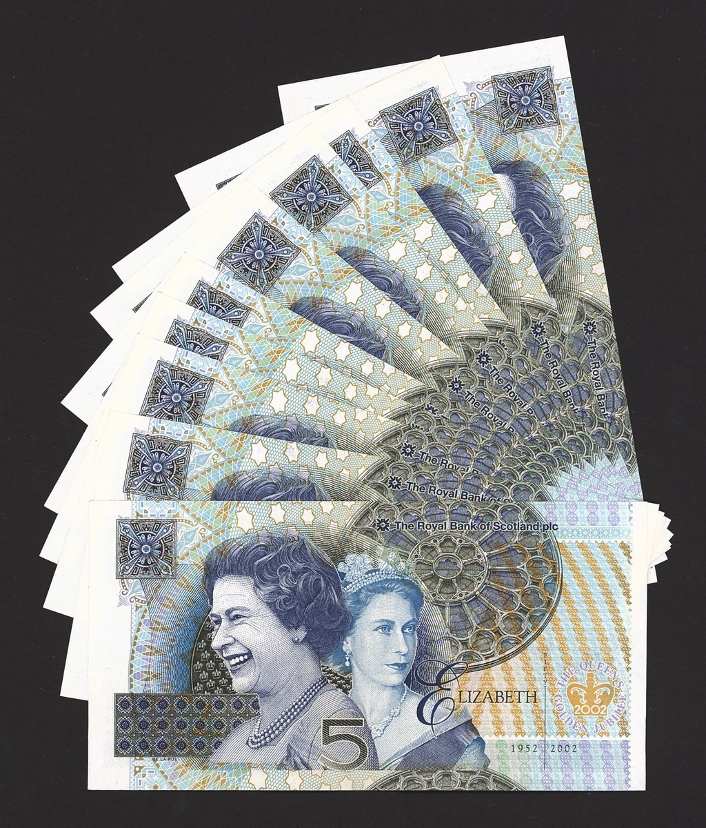 Royal Bank of Scotland, £5, 6 February 2002, serial number TQGJ0000411-420, Lord Ilay First Governor of the Royal Bank of Scotland at right, reverse, portraits of the Queen, showing her at the time of her Coronation and more recently. This note was issued to celebrate 50 years (Golden Jubilee) of the reign of Her Majesty Queen Elizabeth II